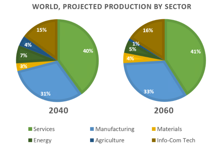 The charts show projections for global production by sector in 2040 and 2060.