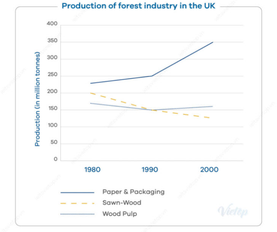 The line graph shows the production of paper, wood-pulp and sawn-wood in the UK from 1980 to 2000.